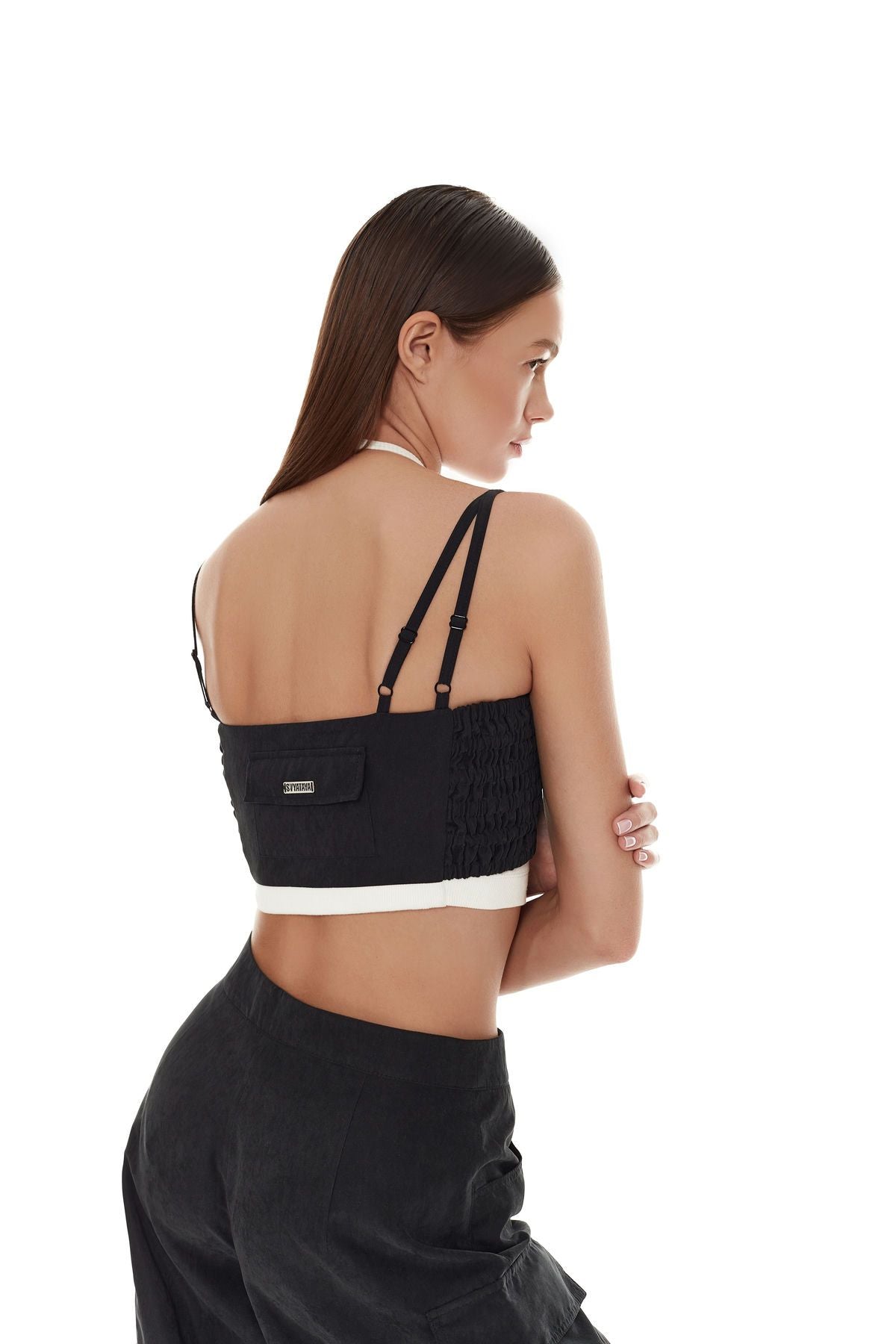 Top aus komfortablem Stoff mit komplexem Schnitt und dem Markenzeichen SVYATAYA auf der Vorderseite, doppellagiges Top, untere Lage aus Jersey. Material: 95 % Polyester, 5 % Spandex, 70 % Viskose, 30 % Polyester.