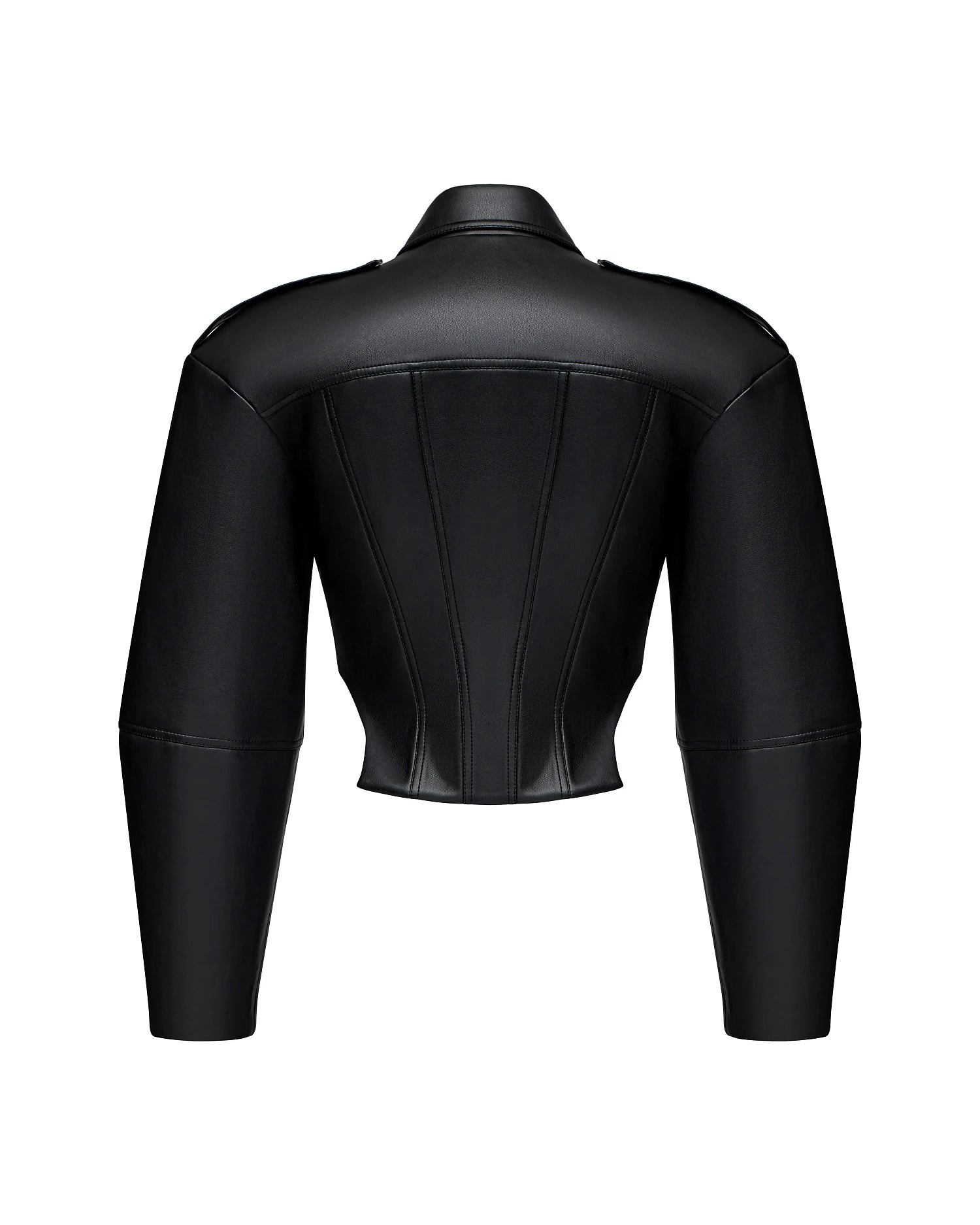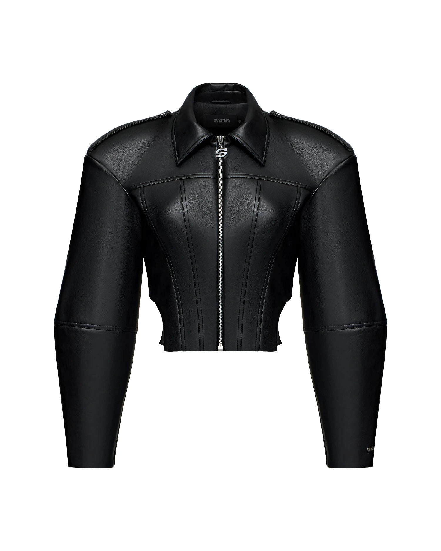 Jacke aus Kunstleder mit strukturierten Nähten, voluminösen Schultern und Umlegekragen, mit Reißverschluss zu schließen.