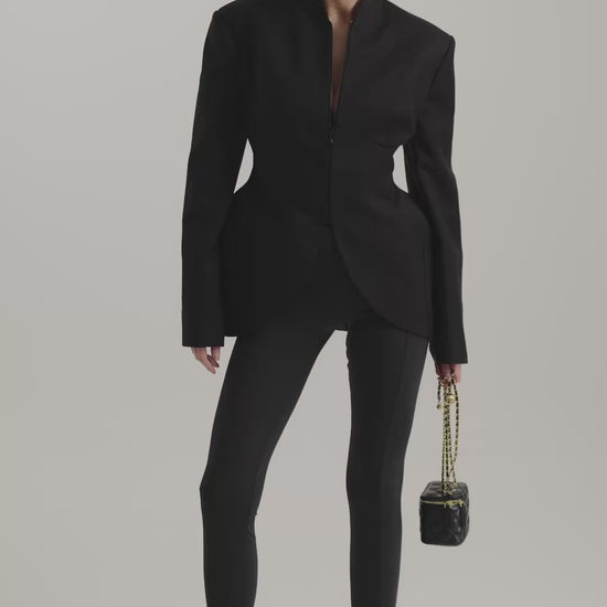 Jacket with accentuated hips, stand-up collar, and front zipper closure